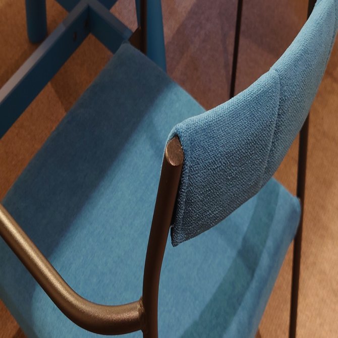 驚いたのは、その色彩の表現力です。ブルーの張地にブルーの鉄脚を組み合わせたスタイルは、これまでの杉山製作所にはなかった新しい表現。鉄ならではの機能美や線美が、これまでにない鮮やかさで際立っています。