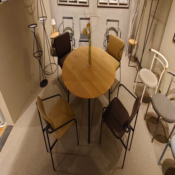 こちらは一転して、鉄の力強さの中に手仕事の温もりを感じる構成です。細身の鉄脚に円形の木天板を合わせたテーブルや、新発表の「felice easy chair」。そして、温かみのあるブラウンの張地を纏ったCrankシリーズが、心地よいラウンジのような空気を作っています。