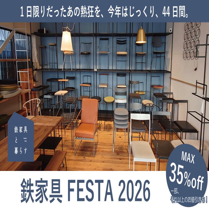 代休や祝日が重なり、少しお久しぶりのブログとなりました。 この2週間のあいだに、社内では「鉄家具FESTA 2026」がスタートし、連日多くのお客様にご来場いただいています。